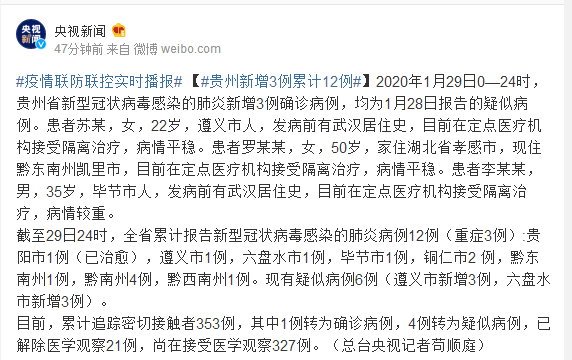 2020年1月29日0—24时,贵州省新型冠状病毒感染的肺炎新增3例确诊病例,均为1月28日报告的疑似病例。患者苏某,女,22岁,遵义市人,发病前有武汉居住史,目前在定点医疗机构接受隔离治疗,病情平稳。患者罗某某,女,50岁,家住湖北省孝感市,现住黔东南州凯里市,目前在定点医疗机构接受隔离治疗,病情平稳。患者李某某,男,35岁,毕节市人,发病前有武汉居住史,目前在定点医疗机构接受隔离治疗,病情较重。