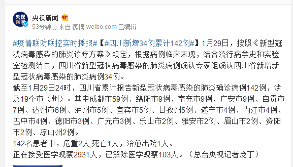1月29日,按照《新型冠状病毒感染的肺炎诊疗方案》规定,根据病例临床表现,结合流行病学史和实验室检测结果,四川省新型冠状病毒感染的肺炎病例确认专家组确认四川省新增新型冠状病毒感染的肺炎病例34例。
