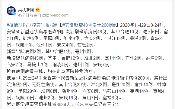2020年1月29日0-24时,安徽省新型冠状病毒感染的肺炎新增确诊病例48例,其中合肥10例、亳州5例、宿州1例、蚌埠5例、阜阳5例、淮南4例、六安2例、马鞍山3例、芜湖3例、宣城2例、铜陵1例、池州1例、安庆4例、宿松2例。
