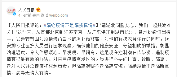 “请湖北同胞安心,我们一起共渡难关!”这些天,从首都北京到江苏南京,从广东湛江到湖南长沙,各地纷纷伸出援手,妥善安置因为疫情滞留当地的湖北籍旅客,为他们解决衣食住行的同时,还安排专业医护人员进行医学观察,确保他们的健康安全。守望相助的举措,彰显治理温度,令人倍感暖心。早发现、早隔离,这是现在控制潜在传染源、遏制疫情蔓延最有效的办法。对来自疫情高发区的人员进行必要的排查、诊断、隔离,是对人民群众健康和权利负责。但隔离观察不是隔绝交流,隔绝疫情不是隔断真情。病毒无情人有情。
