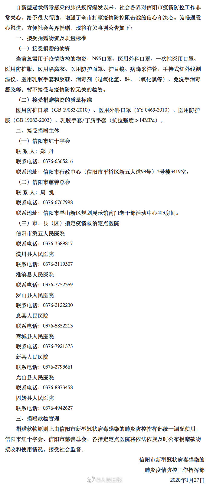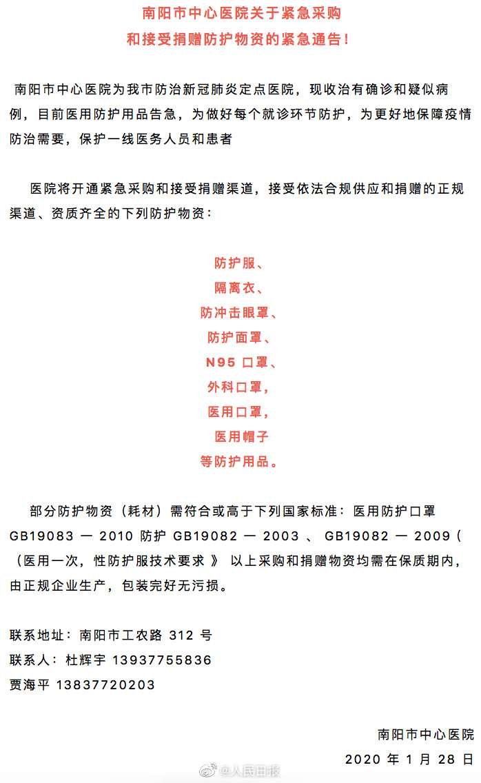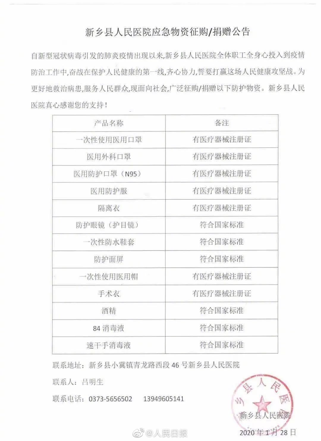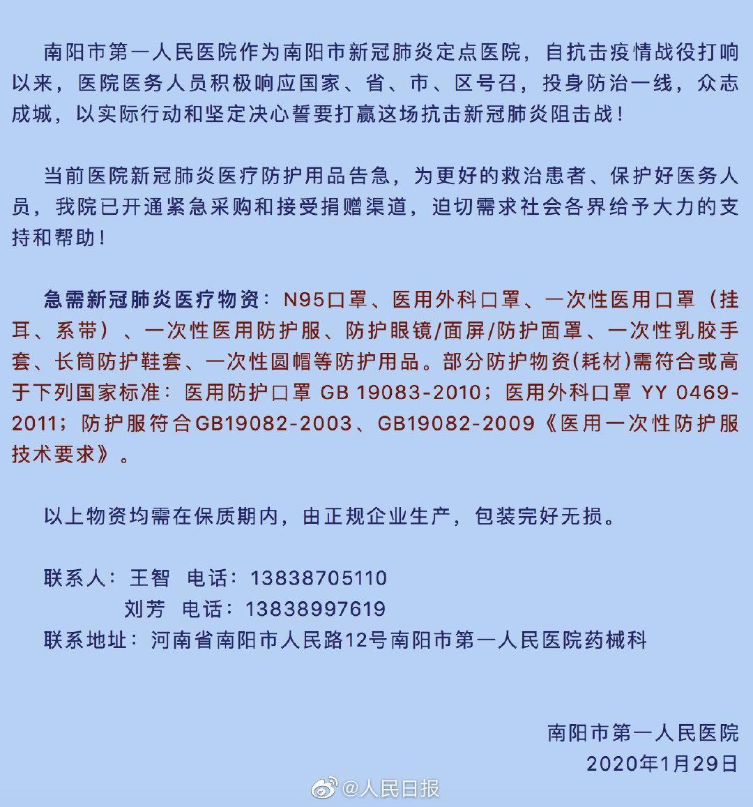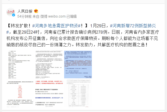 1月29日,#河南新增72例新型肺炎#,截至29日24时,河南省已累计报告确诊病例278例。日前,河南省内多家医疗机构发布公开征集信,向社会求助医疗保障物资。期盼每个人都能为这场看不见硝烟的战役尽自己的一份绵薄之力。转发助力,共解医疗机构的燃眉之急!