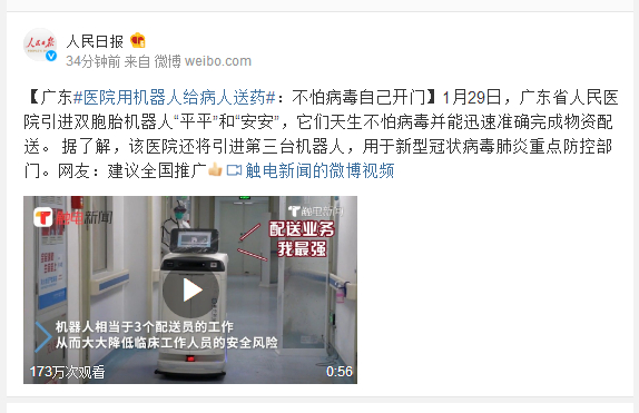1月29日,广东省人民医院引进双胞胎机器人“平平”和“安安”,它们天生不怕病毒并能迅速准确完成物资配送。 据了解,该医院还将引进第三台机器人,用于新型冠状病毒肺炎重点防控部门。网友:建议全国推广