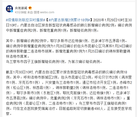 2020年1月29日10时至30日10时,内蒙古自治区报告新型冠状病毒感染的肺炎新增确诊病例2例;确诊病例中新增重症病例2例、新增危重病例1例;新增疑似病例1例。