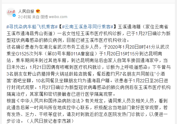 该名确诊患者为在湖北省武汉市务工返乡人员,于2020年1月20日8时41分从武汉乘坐G1525次列车(第03号车厢011A靠窗座)于1月20日15时15分到达昆明南站,乘车期间未到过其他车厢,到达昆明南站后由家人自驾车接回通海家中,当日未外出;1月21日因偶有咳嗽到医疗机构就诊,诊断为上呼吸道感染;下午曾与3名朋友在野山药腊排骨火锅延龄路店就餐,餐后邀约另7名朋友共同前往“小酒馆”酒吧坐聊,10名同餐及坐聊朋友均为通海县户籍。该患者于1月22日至26日进行封闭式观察。1月27日确诊为新型冠状病毒感染的肺炎病例后在玉溪市医疗机构隔离治疗,其家属和密切接触者已进行医学隔离观察。