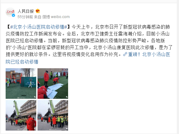 今天上午,北京市召开了新型冠状病毒感染的肺炎疫情防控工作新闻发布会。会后,北京市卫健委主任雷海潮介绍,目前小汤山医院已经启动修缮。当前,新型冠状病毒感染肺炎疫情防控形势严峻。各地版的“小汤山”医院都在紧锣密鼓的开工当中,北京小汤山康复医院此次修缮,是为了提供更好的就诊条件。这里将视疫情变化启用作为补充。