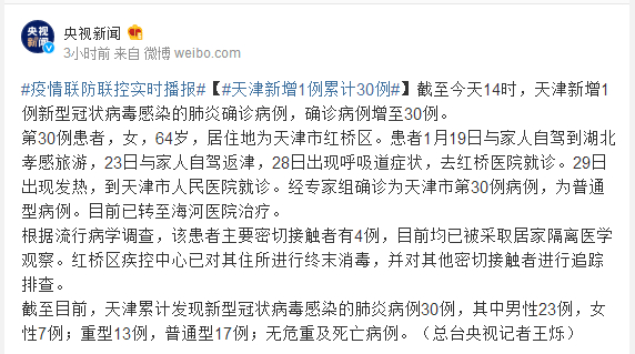 第30例患者,女,64岁,居住地为天津市红桥区。患者1月19日与家人自驾到湖北孝感旅游,23日与家人自驾返津,28日出现呼吸道症状,去红桥医院就诊。29日出现发热,到天津市人民医院就诊。经专家组确诊为天津市第30例病例,为普通型病例。目前已转至海河医院治疗。