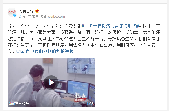 #打护士肺炎病人家属被刑拘#。医生坚守防疫一线,舍小家为大家,该获得礼赞,而非殴打。对医护人员动拳,就是破坏防控疫情工作,尤其让人寒心愤懑!医生不辞辛苦,守护病患生命,我们有责任守护医生安全,守护医疗秩序。用法律为医生讨回公道,用制度安排让医生安心。