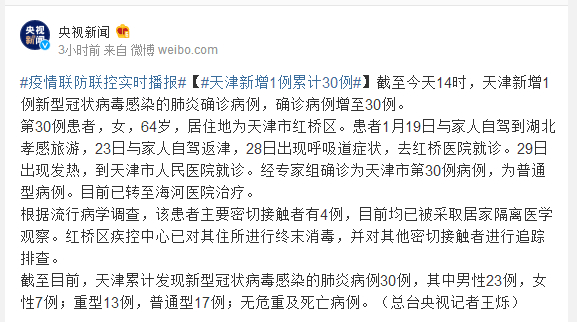 截至1月30日14时天津新增1例新型冠状病毒感染的肺炎确诊病例 累计30例