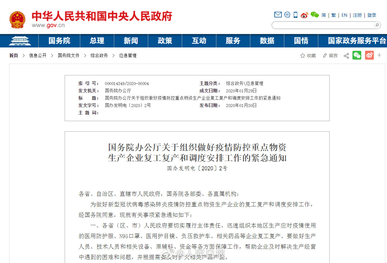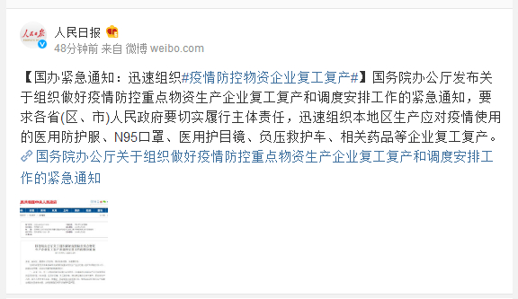 国务院办公厅发布关于组织做好疫情防控重点物资生产企业复工复产和调度安排工作的紧急通知,要求各省(区、市)人民政府要切实履行主体责任,迅速组织本地区生产应对疫情使用的医用防护服、N95口罩、医用护目镜、负压救护车、相关药品等企业复工复产。
