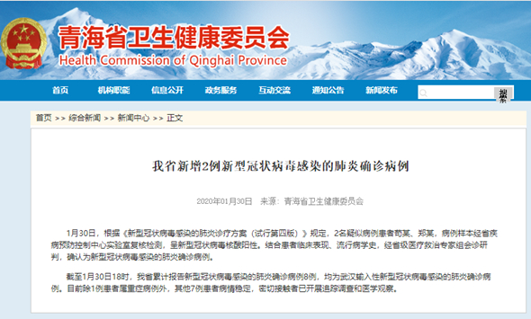 1月30日,根据《新型冠状病毒感染的肺炎诊疗方案(试行第四版)》规定,2名疑似病例患者苟某、郑某,病例样本经省疾病预防控制中心实验室复核检测,呈新型冠状病毒核酸阳性。结合患者临床表现、流行病学史,经省级医疗救治专家组会诊研判,确认为新型冠状病毒感染的肺炎确诊病例。
