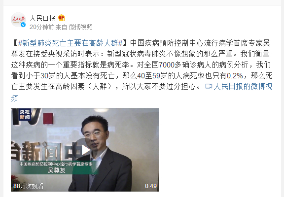 中国疾病预防控制中心流行病学首席专家吴尊友在接受央视采访时表示:新型冠状病毒肺炎不像想象的那么严重。我们衡量这种疾病的一个重要指标就是病死率。对全国7000多确诊病人的病例分析,我们看到小于30岁的人基本没有死亡,那么40至59岁的人病死率也只有0.2%,那么死亡主要发生在高龄因素(人群),所以大家不要过分担心。