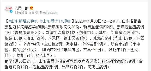 截至1月30日24时,山东省累计报告新型冠状病毒感染的肺炎确诊病例178例(含重症病例10例、危重症病例1例、出院病例2例,无死亡病例)