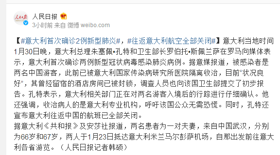 意大利当地时间1月30日晚,意大利总理朱塞佩•孔特和卫生部长罗伯托•斯佩兰萨在罗马向媒体表示,意大利首次确诊两例新型冠状病毒感染肺炎病例。据意媒报道,被感染者是两名中国游客,此前已被意大利国家传染病研究所医院隔离收治,目前“状况良好”,其曾经留宿的酒店房间已被封锁,调查人员也向该国卫生部提交了初步报告。孔特表示,意大利相关部门正在对两名游客入境后的行踪进行仔细确认。他还强调,收治病人的是意大利专业机构,呼吁该国公众无需恐慌。同时,孔特还宣布意大利往返中国的航班已全部关闭。