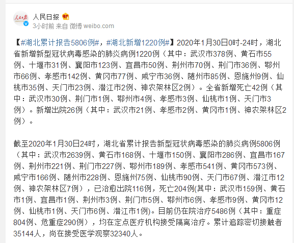 截至2020年1月30日24时,湖北省累计报告新型冠状病毒感染的肺炎病例5806例(其中:武汉市2639例、黄石市168例、十堰市150例、襄阳市286例、宜昌市167例、荆州市221例、荆门市227例、鄂州市189例、孝感市541例、黄冈市573例、咸宁市166例、随州市228例、恩施州75例、仙桃市90例、天门市67例、潜江市12例、神农架林区7例),已治愈出院116例,死亡204例(其中:武汉市159例、黄石市1例、宜昌市1例、荆州市3例、荆门市5例、鄂州市6例、孝感市9例、黄冈市12例、仙桃市1例、天门市6例、潜江市1例)。目前仍在院治疗5486例(其中:重症804例、危重症290例),均在定点医疗机构接受隔离治疗。累计追踪密切接触者35144人,尚在接受医学观察32340人。