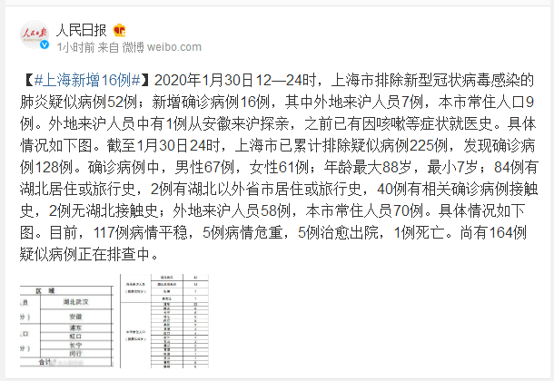 2020年1月30日12—24时,上海市排除新型冠状病毒感染的肺炎疑似病例52例;新增确诊病例16例,其中外地来沪人员7例,本市常住人口9例。外地来沪人员中有1例从安徽来沪探亲,之前已有因咳嗽等症状就医史。具体情况如下图。截至1月30日24时,上海市已累计排除疑似病例225例,发现确诊病例128例。确诊病例中,男性67例,女性61例;年龄最大88岁,最小7岁;84例有湖北居住或旅行史,2例有湖北以外省市居住或旅行史,40例有相关确诊病例接触史,2例无湖北接触史;外地来沪人员58例,本市常住人员70例。具体情况如下图。目前,117例病情平稳,5例病情危重,5例治愈出院,1例死亡。尚有164例疑似病例正在排查中。