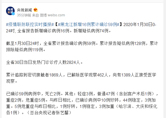 已确诊59例病例中,死亡2例。其他:轻症3例,普通47例(含剖宫产术后1例),重症2例,危重症5例。与昨日相比,已确诊病例中10例好转,44例稳定,3例加重。5例危重症与昨日相比,1例好转,1例稳定,3例加重(哈尔滨、大庆和绥化各1例)。(总台央视记者张艺馨)