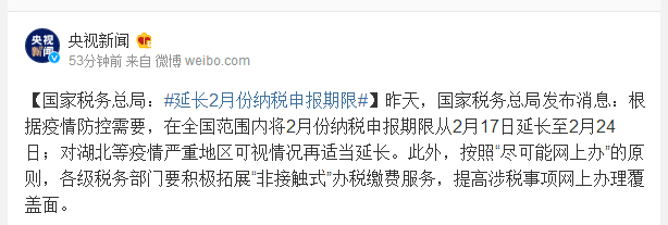 昨天,国家税务总局发布消息:根据疫情防控需要,在全国范围内将2月份纳税申报期限从2月17日延长至2月24日;对湖北等疫情严重地区可视情况再适当延长。此外,按照“尽可能网上办”的原则,各级税务部门要积极拓展“非接触式”办税缴费服务,提高涉税事项网上办理覆盖面。