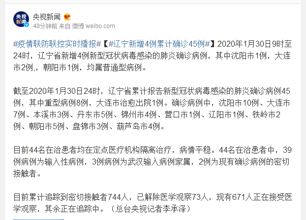 2020年1月30日9时至24时,辽宁省新增4例新型冠状病毒感染的肺炎确诊病例,其中沈阳市1例,大连市2例,,朝阳市1例,均属普通型病例。
