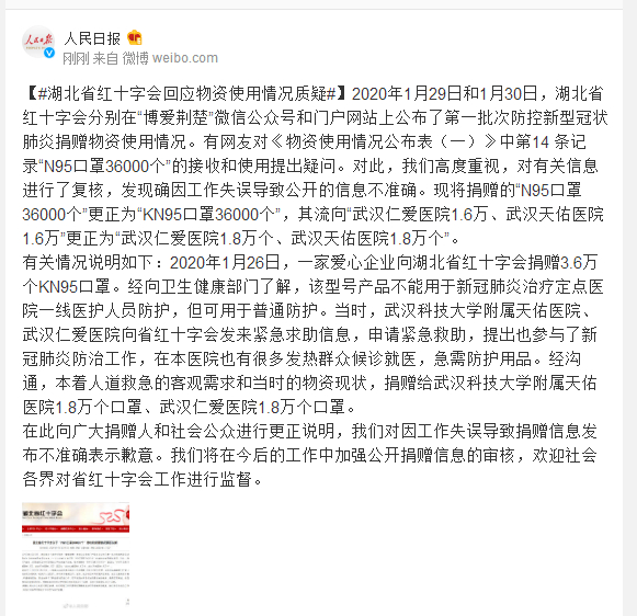 2020年1月29日和1月30日,湖北省红十字会分别在“博爱荆楚”微信公众号和门户网站上公布了第一批次防控新型冠状肺炎捐赠物资使用情况。有网友对《物资使用情况公布表(一)》中第14 条记录“N95口罩36000个”的接收和使用提出疑问。对此,我们高度重视,对有关信息进行了复核,发现确因工作失误导致公开的信息不准确。现将捐赠的“N95口罩36000个”更正为“KN95口罩36000个”,其流向“武汉仁爱医院1.6万、武汉天佑医院1.6万”更正为“武汉仁爱医院1.8万个、武汉天佑医院1.8万个”。