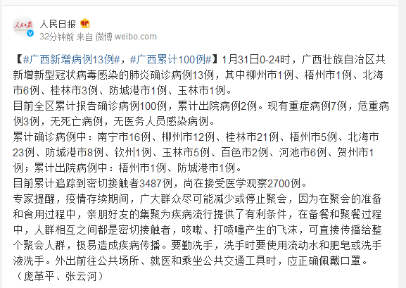 1月31日0-24时,广西壮族自治区共新增新型冠状病毒感染的肺炎确诊病例13例,其中柳州市1例、梧州市1例、北海市6例、桂林市3例、防城港市1例、玉林市1例。