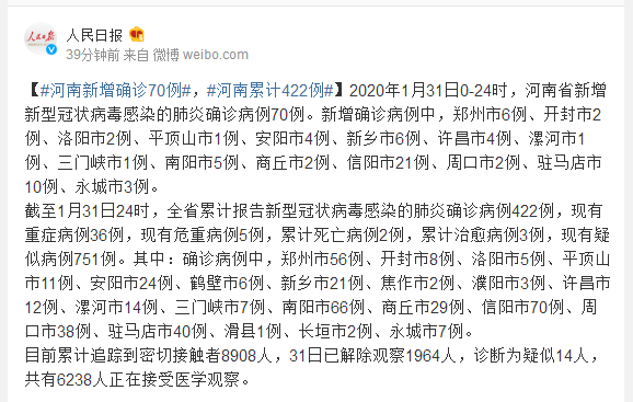 截至1月31日24时,全省累计报告新型冠状病毒感染的肺炎确诊病例422例,现有重症病例36例,现有危重病例5例,累计死亡病例2例,累计治愈病例3例,现有疑似病例751例。其中:确诊病例中,郑州市56例、开封市8例、洛阳市5例、平顶山市11例、安阳市24例、鹤壁市6例、新乡市21例、焦作市2例、濮阳市3例、许昌市12例、漯河市14例、三门峡市7例、南阳市66例、商丘市29例、信阳市70例、周口市38例、驻马店市40例、滑县1例、长垣市2例、永城市7例。