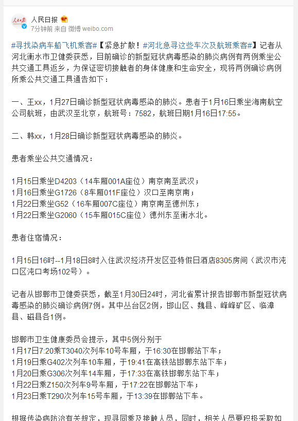 记者从河北衡水市卫健委获悉,目前确诊的新型冠状病毒感染的肺炎病例有两例乘坐公共交通工具返乡,为保证密切接触者的身体健康和生命安全,现将两例确诊病例所乘公共交通工具通告如下: