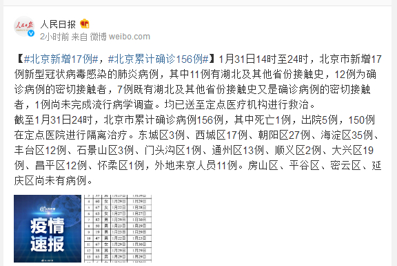 截至1月31日24时,北京市累计确诊病例156例,其中死亡1例,出院5例,150例在定点医院进行隔离治疗。东城区3例、西城区17例、朝阳区27例、海淀区35例、丰台区12例、石景山区3例、门头沟区1例、通州区13例、顺义区2例、大兴区19例、昌平区12例、怀柔区1例,外地来京人员11例。房山区、平谷区、密云区、延庆区尚未有病例。