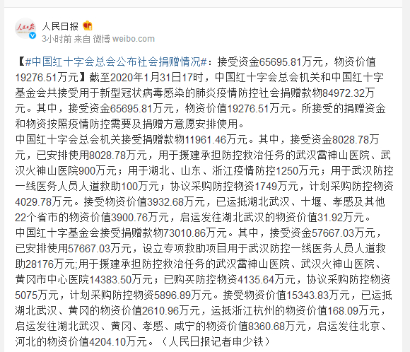 截至2020年1月31日17时,中国红十字会总会机关和中国红十字基金会共接受用于新型冠状病毒感染的肺炎疫情防控社会捐赠款物84972.32万元。其中,接受资金65695.81万元,物资价值19276.51万元。所接受的捐赠资金和物资按照疫情防控需要及捐赠方意愿安排使用。