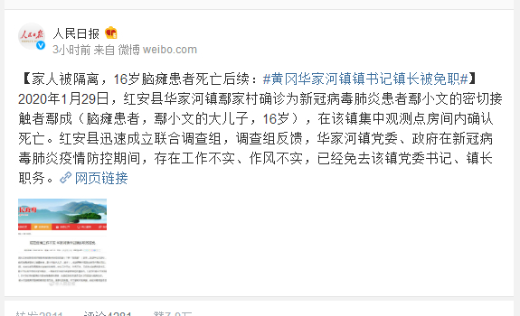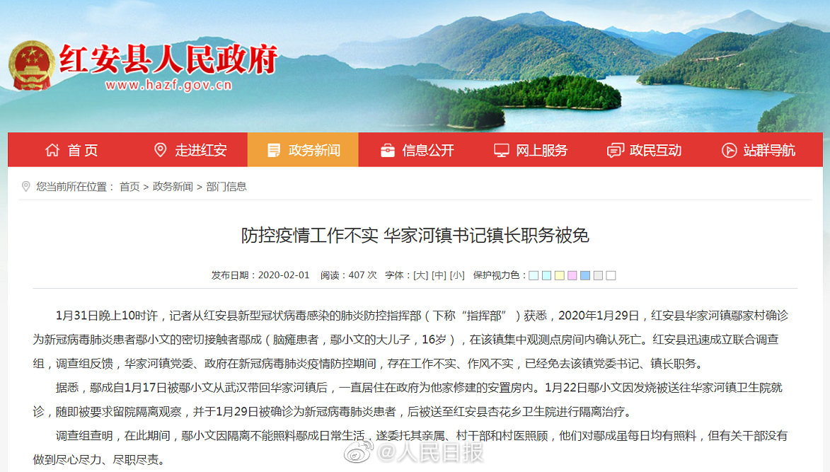 2020年1月29日,红安县华家河镇鄢家村确诊为新冠病毒肺炎患者鄢小文的密切接触者鄢成(脑瘫患者,鄢小文的大儿子,16岁),在该镇集中观测点房间内确认死亡。红安县迅速成立联合调查组,调查组反馈,华家河镇党委、政府在新冠病毒肺炎疫情防控期间,存在工作不实、作风不实,已经免去该镇党委书记、镇长职务。