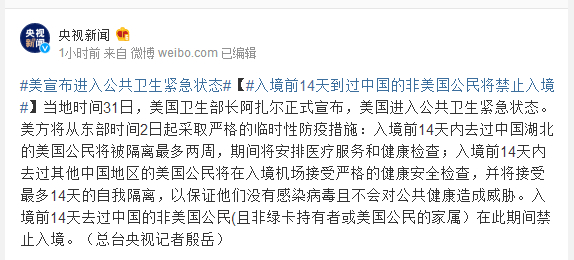当地时间31日,美国卫生部长阿扎尔正式宣布,美国进入公共卫生紧急状态。美方将从东部时间2日起采取严格的临时性防疫措施:入境前14天内去过中国湖北的美国公民将被隔离最多两周,期间将安排医疗服务和健康检查;入境前14天内去过其他中国地区的美国公民将在入境机场接受严格的健康安全检查,并将接受最多14天的自我隔离,以保证他们没有感染病毒且不会对公共健康造成威胁。入境前14天去过中国的非美国公民(且非绿卡持有者或美国公民的家属)在此期间禁止入境。(总台央视记者殷岳)
