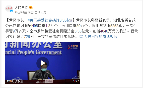 黄冈市长邱丽新表示,湖北省委省政务已向黄冈调配N95口罩1.3万个,医用口罩80万个,医用防护服5252套,一次性手套9万多双。全市累计接受社会捐赠资金3.35亿元,包括4046万元的物资。但黄冈累计确诊726例,医疗物资依然非常紧缺。
