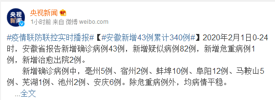 #安徽新增43例累计340例#:2020年2月1日0-24时,安徽省报告新增确诊病例43例,新增疑似病例82例,新增危重病例1例,新增治愈出院2例。新增确诊病例中,亳州5例、宿州2例、蚌埠10例、阜阳12例、马鞍山5例、芜湖1例、池州2例、安庆6例。除危重病例外,均病情平稳。