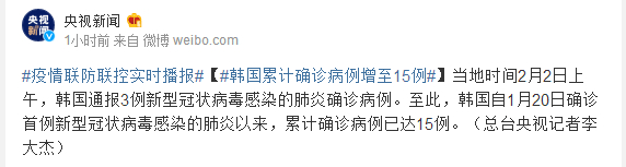当地时间2月2日上午,韩国通报3例新型冠状病毒感染的肺炎确诊病例。至此,韩国自1月20日确诊首例新型冠状病毒感染的肺炎以来,累计确诊病例已达15例。(总台央视记者李大杰)