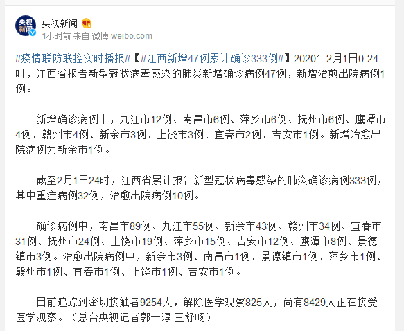 截至2月1日24时,江西省累计报告新型冠状病毒感染的肺炎确诊病例333例,其中重症病例32例,治愈出院病例10例。