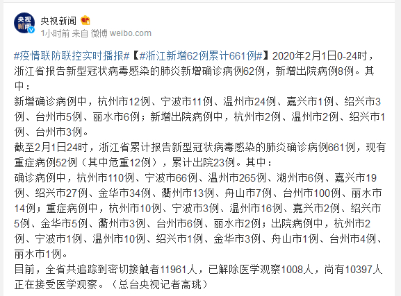 截至2月1日24时,浙江省累计报告新型冠状病毒感染的肺炎确诊病例661例,现有重症病例52例(其中危重12例),累计出院23例。其中: