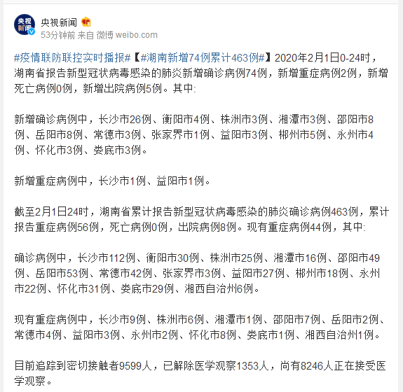 2020年2月1日0-24时,湖南省报告新型冠状病毒感染的肺炎新增确诊病例74例,新增重症病例2例,新增死亡病例0例,新增出院病例5例。其中: