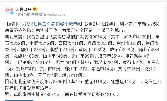 截至2月1日24时,湖北黄冈市新型冠状病毒感染的肺炎病例过千例,为武汉外全国第二个破千的城市。