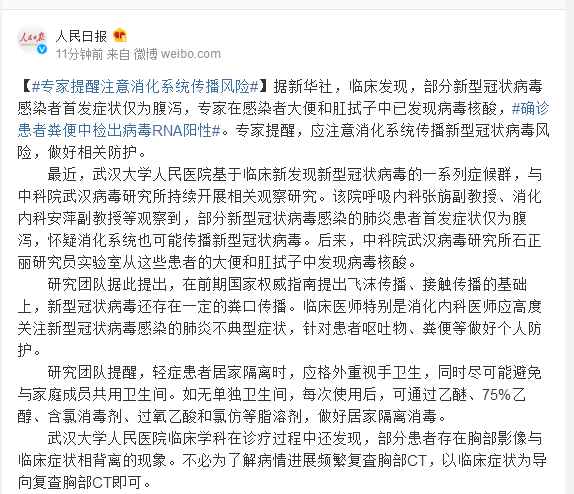 据新华社,临床发现,部分新型冠状病毒感染者首发症状仅为腹泻,专家在感染者大便和肛拭子中已发现病毒核酸,#确诊患者粪便中检出病毒RNA阳性#。专家提醒,应注意消化系统传播新型冠状病毒风险,做好相关防护。
