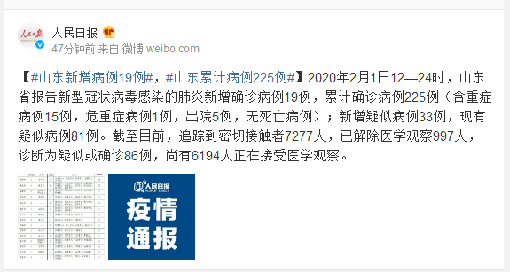 2020年2月1日12—24时,山东省报告新型冠状病毒感染的肺炎新增确诊病例19例,累计确诊病例225例(含重症病例15例,危重症病例1例,出院5例,无死亡病例);新增疑似病例33例,现有疑似病例81例。截至目前,追踪到密切接触者7277人,已解除医学观察997人,诊断为疑似或确诊86例,尚有6194人正在接受医学观察。