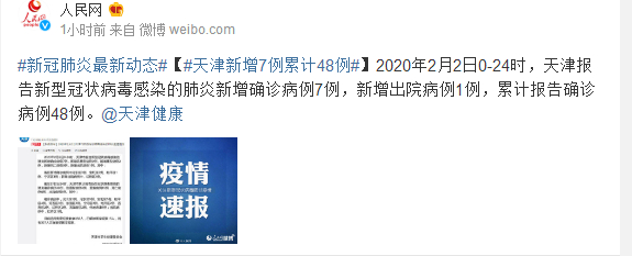 2月2日0-24时天津新型肺炎新增7例 累计48例