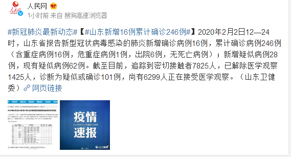2020年2月2日12—24时,山东省报告新型冠状病毒感染的肺炎新增确诊病例16例,累计确诊病例246例(含重症病例16例,危重症病例1例,出院6例,无死亡病例);新增疑似病例28例,现有疑似病例62例。截至目前,追踪到密切接触者7825人,已解除医学观察1425人,诊断为疑似或确诊101例,尚有6299人正在接受医学观察。(山东卫健委)