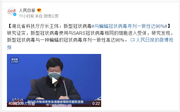 湖北省科技厅厅长王炜:新型冠状病毒#与蝙蝠冠状病毒序列一致性达96%