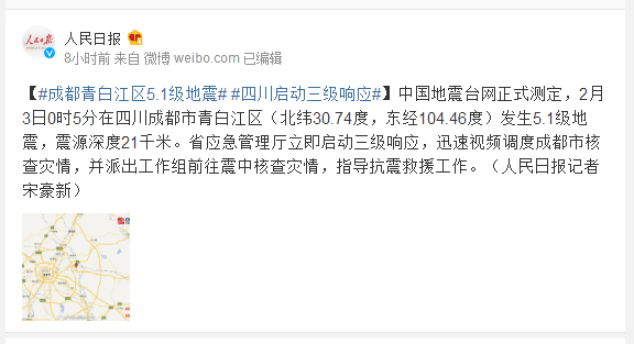 中国地震台网正式测定,2月3日0时5分在四川成都市青白江区(北纬30.74度,东经104.46度)发生5.1级地震,震源深度21千米。省应急管理厅立即启动三级响应,迅速视频调度成都市核查灾情,并派出工作组前往震中核查灾情,指导抗震救援工作。(人民日报记者宋豪新)
