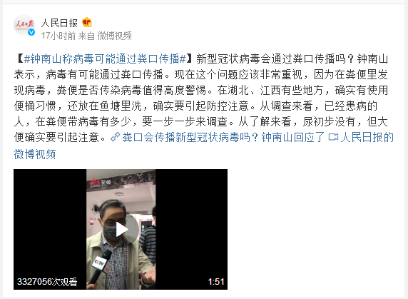 新型冠状病毒会通过粪口传播吗?钟南山表示,病毒有可能通过粪口传播。现在这个问题应该非常重视,因为在粪便里发现病毒,粪便是否传染病毒值得高度警惕。在湖北、江西有些地方,确实有使用便桶习惯,还放在鱼塘里洗,确实要引起防控注意。从调查来看,已经患病的人,在粪便带病毒有多少,要一步一步来调查。从了解来看,尿初步没有,但大便确实要引起注意。
