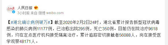 截至2020年2月2日24时,湖北省累计报告新型冠状病毒感染的肺炎病例11177例,已治愈出院295例,死亡350例。目前仍在院治疗9618例,均在定点医疗机构接受隔离治疗。累计追踪密切接触者56088人,尚在接受医学观察48171人。