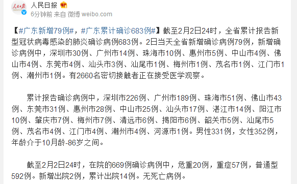 截至2月2日24时,全省累计报告新型冠状病毒感染的肺炎确诊病例683例。2日当天全省新增确诊病例79例,新增确诊病例中,深圳市30例、广州市14例、珠海市10例、惠州市5例、中山市4例、佛山市4例、东莞市4例、汕头市3例、汕尾市1例、梅州市1例、茂名市1例、江门市1例、潮州市1例。有2660名密切接触者正在接受医学观察。