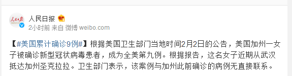 根据美国卫生部门当地时间2月2日的公告,美国加州一女子被确诊新型冠状病毒患者,成为全美第九例。根据报告,这名女子近期从武汉抵达加州圣克拉拉。卫生部门表示,该案例与加州此前确诊的病例无直接联系。