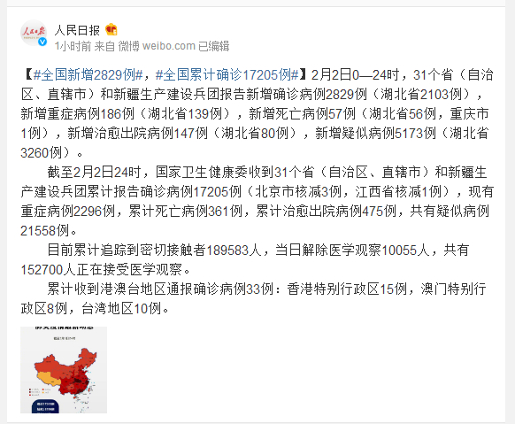 截至2月2日24时,国家卫生健康委收到31个省(自治区、直辖市)和新疆生产建设兵团累计报告确诊病例17205例(北京市核减3例,江西省核减1例),现有重症病例2296例,累计死亡病例361例,累计治愈出院病例475例,共有疑似病例21558例。