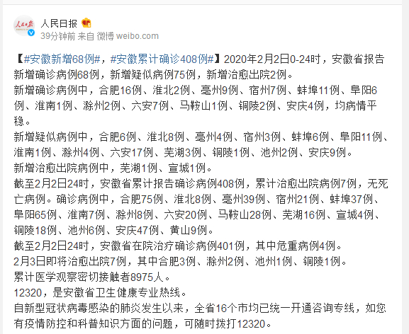 截至2月2日24时,安徽省在院治疗确诊病例401例,其中危重病例4例。