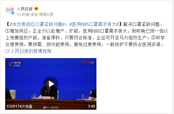 解决口罩紧缺问题:①增加供应。正全力以赴增产、扩能,医用N95口罩需求很大,到昨晚已按一倍以上规模组织产能,准备原料,只要符合标准,企业可开足马力组织生产;②科学合理使用。要按需、按功能使用,避免过度使用。一般防护不要挤占医用资源。